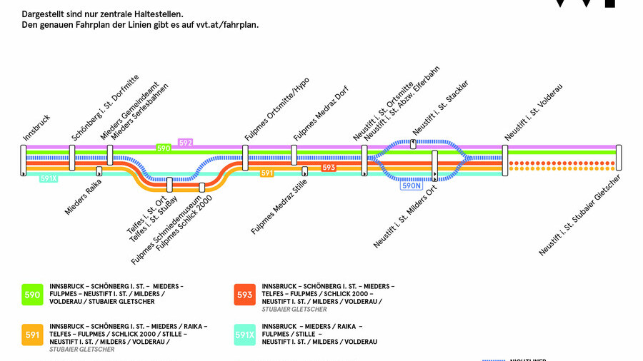 593: Innsbruck Hbf - Schönberg - Telfes - Schlick - Medraz Dorf - Neustift i. St. Ortsmitte - Milders - Stubaier Gletscher.